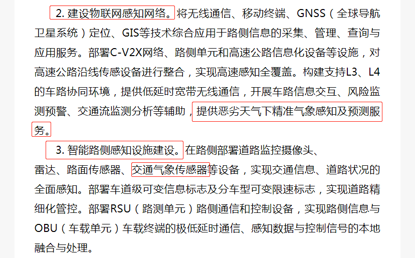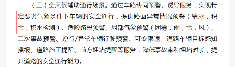 主要內(nèi)容中指出,要建設(shè)物聯(lián)網(wǎng)感知網(wǎng)絡(luò)與智能路側(cè)感知設(shè)施(如交通氣象傳感器、路面?zhèn)鞲衅鳎?,提供惡劣天氣下氣象感知及預(yù)測服務(wù),提供路面異常情況預(yù)警(結(jié)冰,積雪,積水檢測)、危險路段預(yù)警、局部氣象預(yù)警(團霧,雨,雪,風(fēng))、二次事故預(yù)警、逆行/異常車輛行駛預(yù)警、可變限速、道路車輛目標(biāo)感知播報、道路施工提醒、前方擁堵提醒等服務(wù),降低事故率和擁堵時長,實現(xiàn)交通信息、道路狀況的全面感知,提升道路的安全通行能力。
